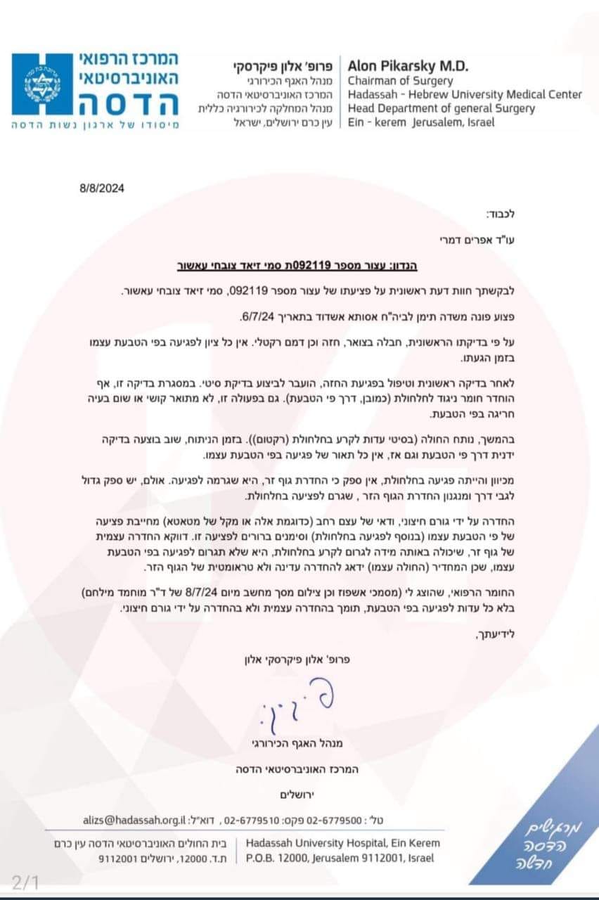 Это - заключение профессора Алона Пикарского из больницы Хадасса Эйн Карем касательно террориста из Сде Тейман, якобы изнасилованного солдатами с помощью палки.