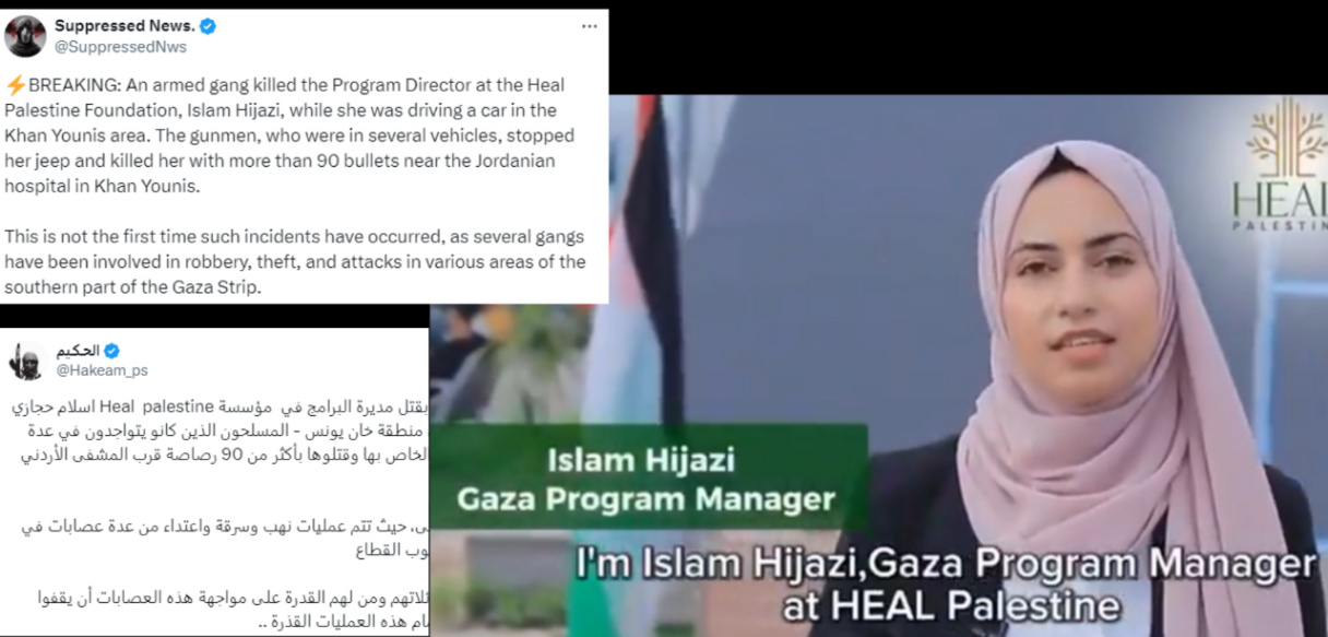 Исполнительный директор контролируемой ООН ассоциации "Лечим Палестину" (Heal Palestine) Ислам Хиджази (Islam Hijazi) была убита на территории полевого госпиталя в Хан-Юнесе. Хотя "минздрав Газы" тут же объявил об "очередном преступлении сионистских агрессоров", по заявлению самой организации, женщина была убита боевиками ХАМАСа. И по причине того, что отказывалась делать откаты в пользу террористической организации. Говоря проще, отдавать ХАМАСу гуманитарку, поступающую для больных палестинцев, в основном женщин детей.