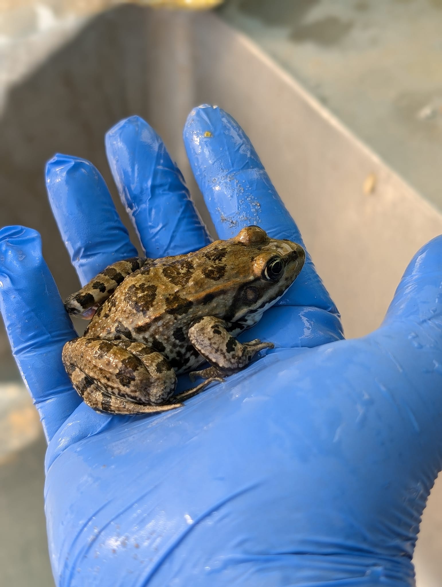 В баке (заросшем водорослями и с кучей укрытий, хрен разберешься) живет два десятка лягушек, из которых одну поймали в природе, а девятнадцать я вырастила с головастиков.