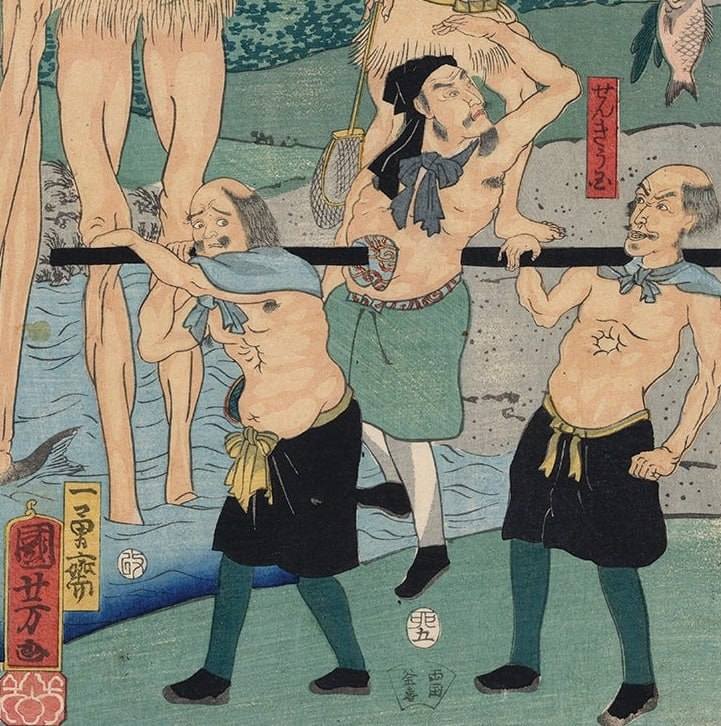 Варварская литература, а именно известный роман Джонатана Свифта про приключения Гулливера, вероятнее всего, и вдохновила эдосского писателя, изобретателя и фармацевта Хирагу Гэнная (его портрет — на первой картинке) на эту весьма остроумную сатиру. Под псевдонимом Фурай Сандзин он сочинил «Путешествия Асаносина», в которых главный герой также попадает в страну великанов, потом в страну длинноногих людей (о них поговорим отдельно), после чего оказывается в Стране Дырогрудых. Кстати, прилетел он туда на большом птичьем (?) пере, ставшем его "пером-самолётом".