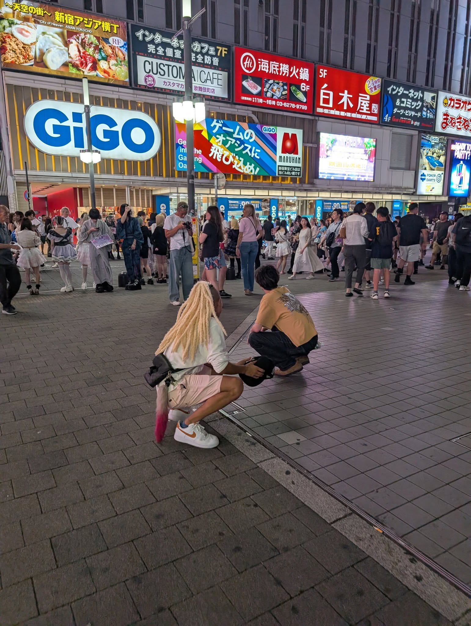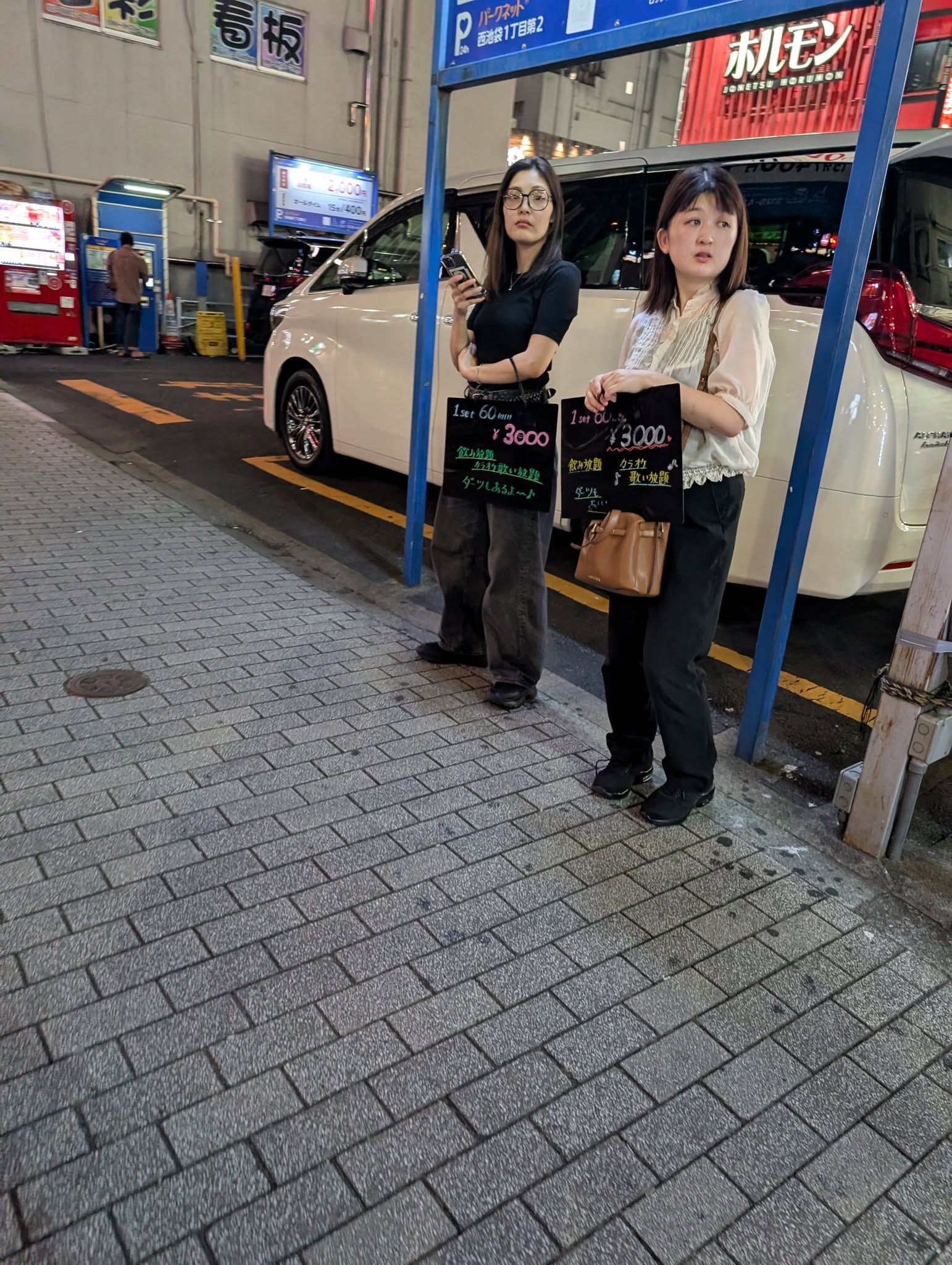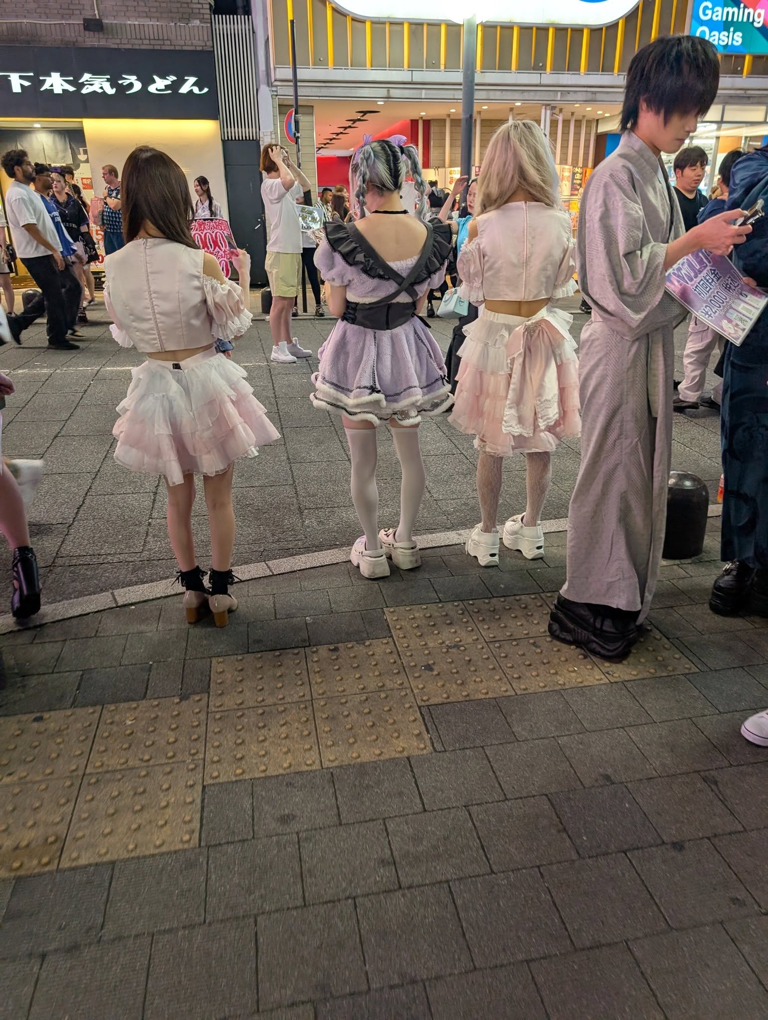 Оказывается ночью район Сендзюку становится весьма злачным, забит, как трамвай с вокзала, бухой в жопу молодежью и работающими лольками. Тут это легально, так что стоят с ценами. По-английски не написано, значит, не для туристов стоят.