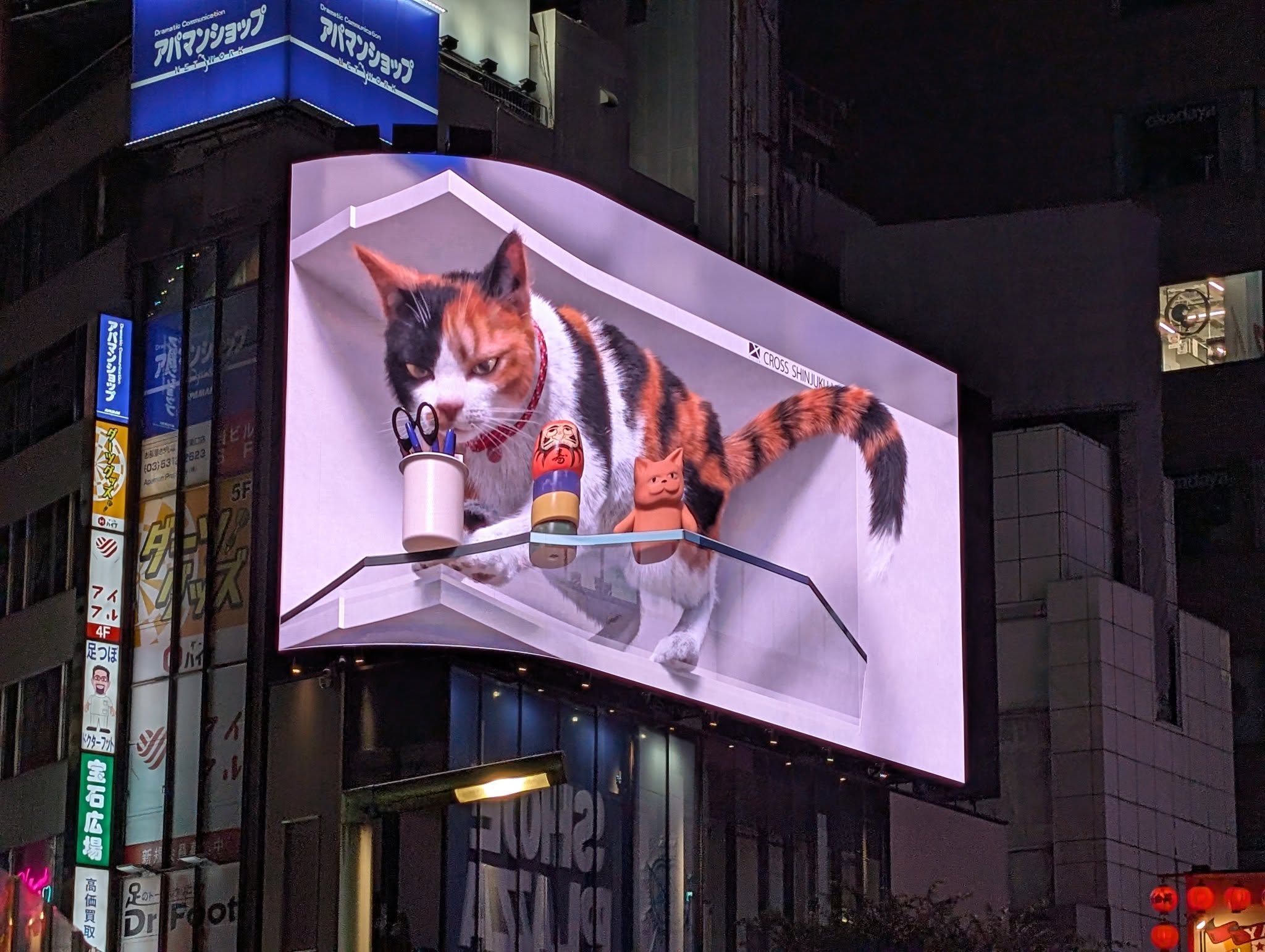 Пошли мы в моцаш, часов в десять, посмотреть знаменитого трехмерного котика на угловой рекламе во весь небоскреб. Котик был. Котика сопровождали это... как бы выразиться... весьма колоритные граждане.