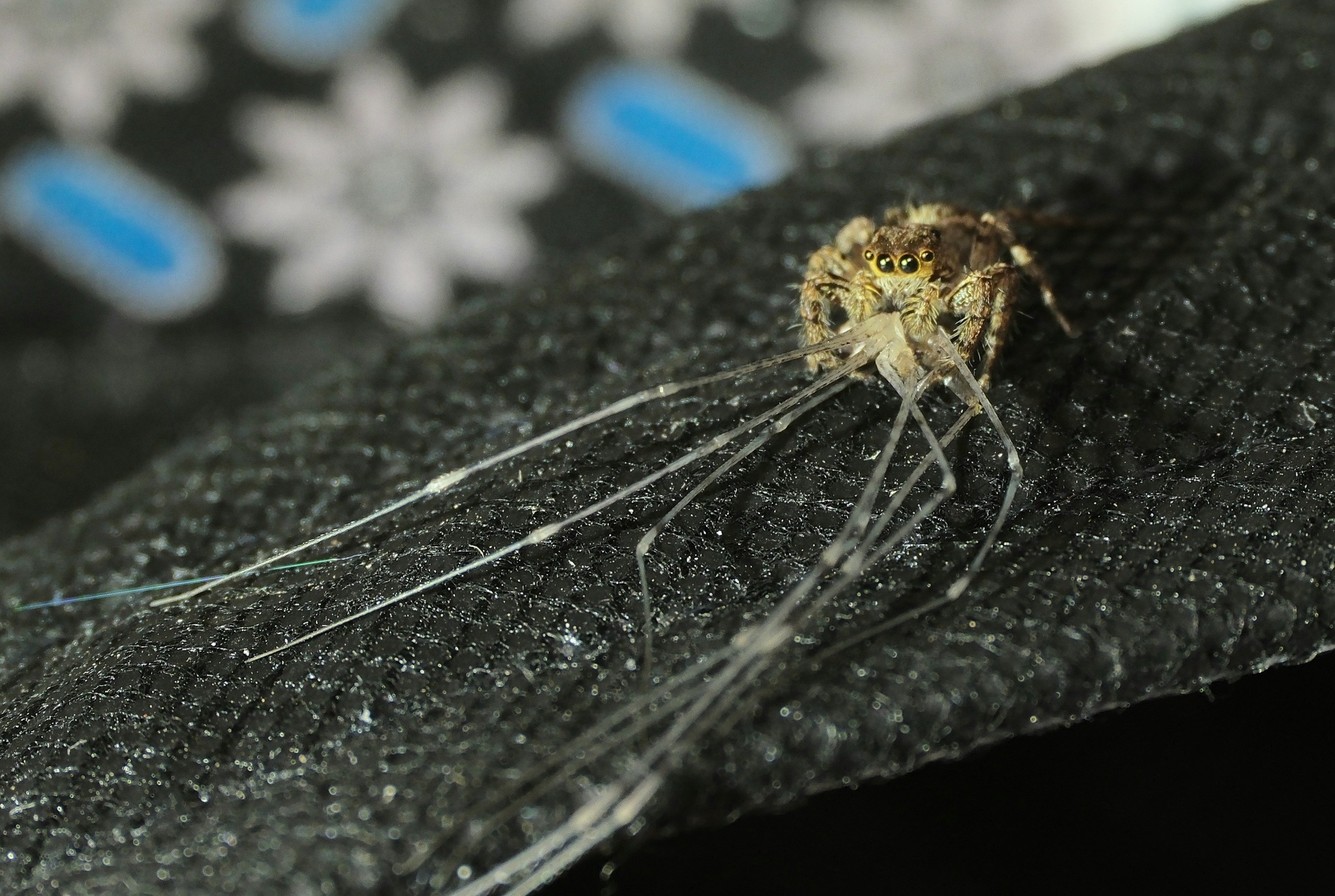 Этот мистер в_рот_мне_ноги – огромный, один из самых больших на Бали паук-скакунчик. Застукала его сейчас с поличным на хозяйственной сумке. Лапша, которая свисает у него изо рта - это ноги свежеубиенного сенокосца.