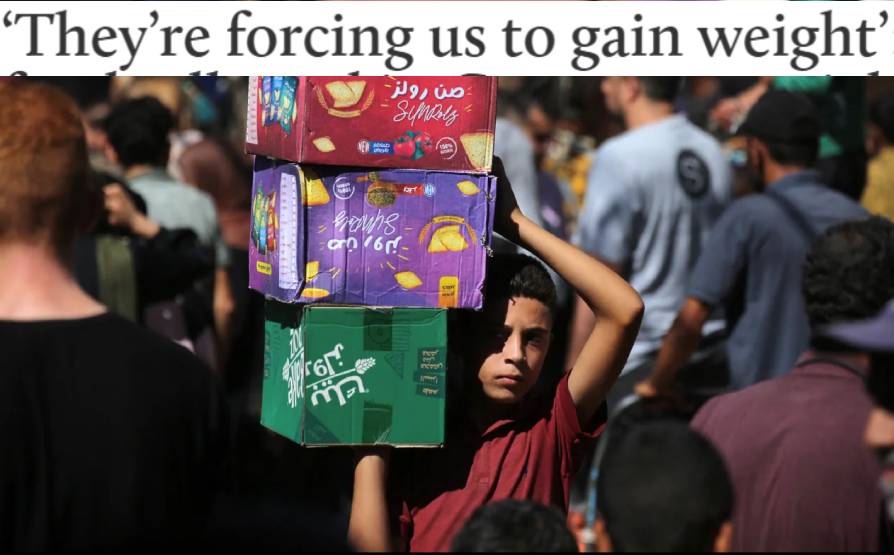 Правозащитные организации вслед за "минздравом Газы" обвиняют Израиль в "политике контролируемого ожирения" (Forced Obesity Policy) палестинского народа. Это то же самое, что принудительный голод, но только наоборот. В общем, жироцид во всей его красе.