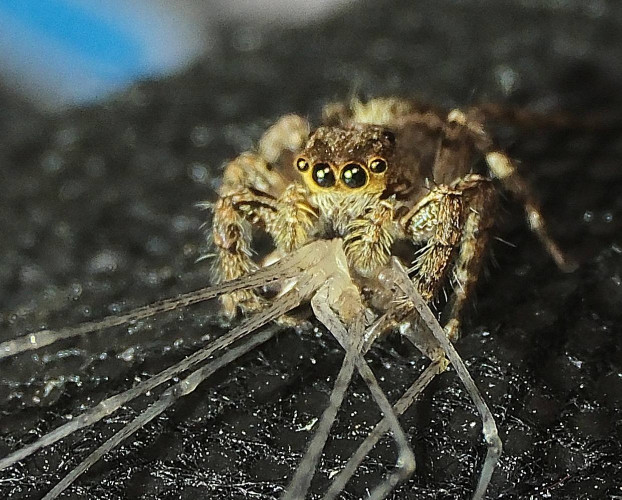 Огромный он, конечно, только по меркам скакунчиков, а так-то сантиметра полтора. Но прыгает на все 20. И не абы как: измеряет расстояние маленькими боковыми глазами, прицеливается огромными центральными. Глазомер у него как у боженьки, до 70% атак успешны.
